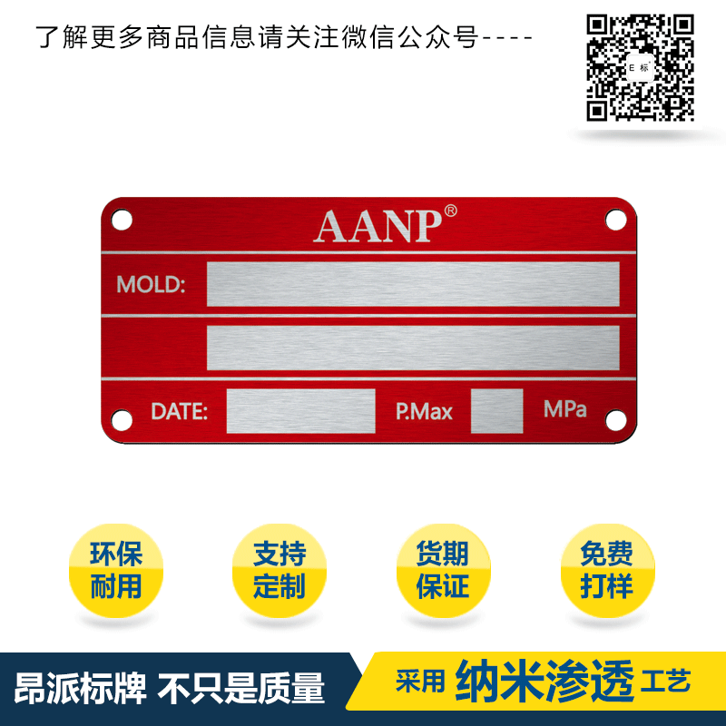 設備防偽鋁合金銘牌標牌 時間:2025-05-06 12:35:20 分類:防偽銘牌 瀏覽:次 標識世界,標示未來(標識世界:打造標識標牌產品的世界,提供標識標牌全方位的解決方案。標示未來: 遵循科技發(fā)展觀,可持續(xù)發(fā)展的理念。)截至2021年底我們擁有的客戶達6500家,涉及汽車、閥門、機械制造、冶金等各個行業(yè)領域,產能及產值位居銘牌行業(yè)前列 分享收藏: 上一個: 泵閥設備防偽銘牌標牌 下一個: 柱塞泵防偽銘牌標牌 相關案例