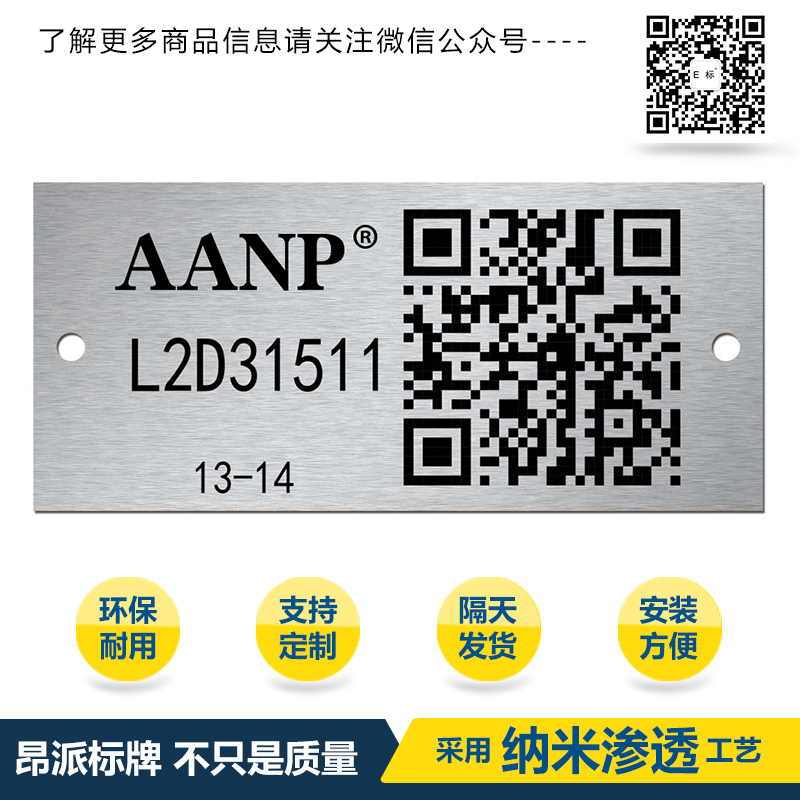 儀器零件二維碼銘牌標(biāo)牌 時間:2018-05-18 18:39:18 分類:金屬二維碼 瀏覽:次 關(guān)于金屬二維碼使用特征: 金屬二維碼---進口納米鋁板---高科技德國滲透印刷技術(shù)---耐摩擦,耐溶劑,耐高溫,抗摩擦,耐紫外線,耐化學(xué)品性,耐腐蝕性,滲透印刷技術(shù)做出來的金屬二維碼使用壽命長,不易掉色,金屬二維碼識別率快,掃描率高。 分享收藏: 上一個: 樹木二維碼銘牌標(biāo)牌 下一個: 倉庫管理二維碼銘牌標(biāo)牌 相關(guān)產(chǎn)品 托盤二維碼銘牌標(biāo)牌 金屬貨架二維碼銘牌標(biāo)牌 汽車二維碼銘牌標(biāo)牌 設(shè)施二維碼銘牌標(biāo)牌 機器二維碼銘牌標(biāo)牌 石油二維碼銘牌標(biāo)牌