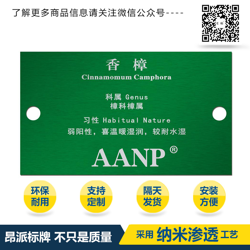 物業(yè)樹木銘牌標(biāo)牌 時間:2018-05-18 18:33:51 分類:金屬銘牌 瀏覽:次 標(biāo)牌、銘牌、鋁牌的品質(zhì): 金屬標(biāo)牌能使鋁制產(chǎn)品表面產(chǎn)生堅硬的保護(hù)層,此保護(hù)層的特點(diǎn)是:耐候性低、抗惡劣天氣,不受臭氧、空氣污染、酸雨侵襲;耐紫外線、抗紫外線、抗粉化;耐化學(xué)品性、抗酸堿侵蝕;耐腐蝕性,氧化潮氣鹽份滲透率低;防霉菌污損耐濕性優(yōu),并能保持光潔如新,易于保養(yǎng)清洗,不易變色、褪色、價格廉價.,歡迎各位來采購。 分享收藏: 上一個: 鋁合金銘牌標(biāo)牌 下一個: 機(jī)械名稱銘牌標(biāo)牌 相關(guān)產(chǎn)品